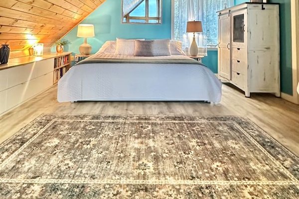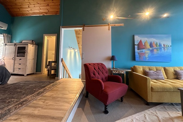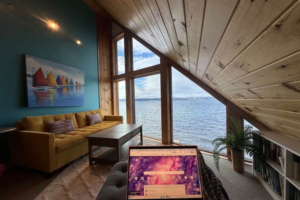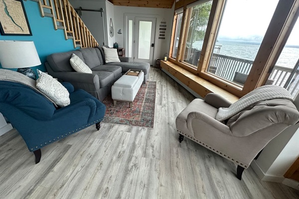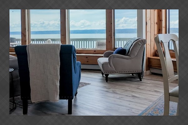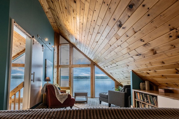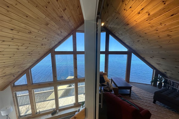 Enjoy stunning panoramic views from this vaulted living room that boasts floor to ceiling windows.